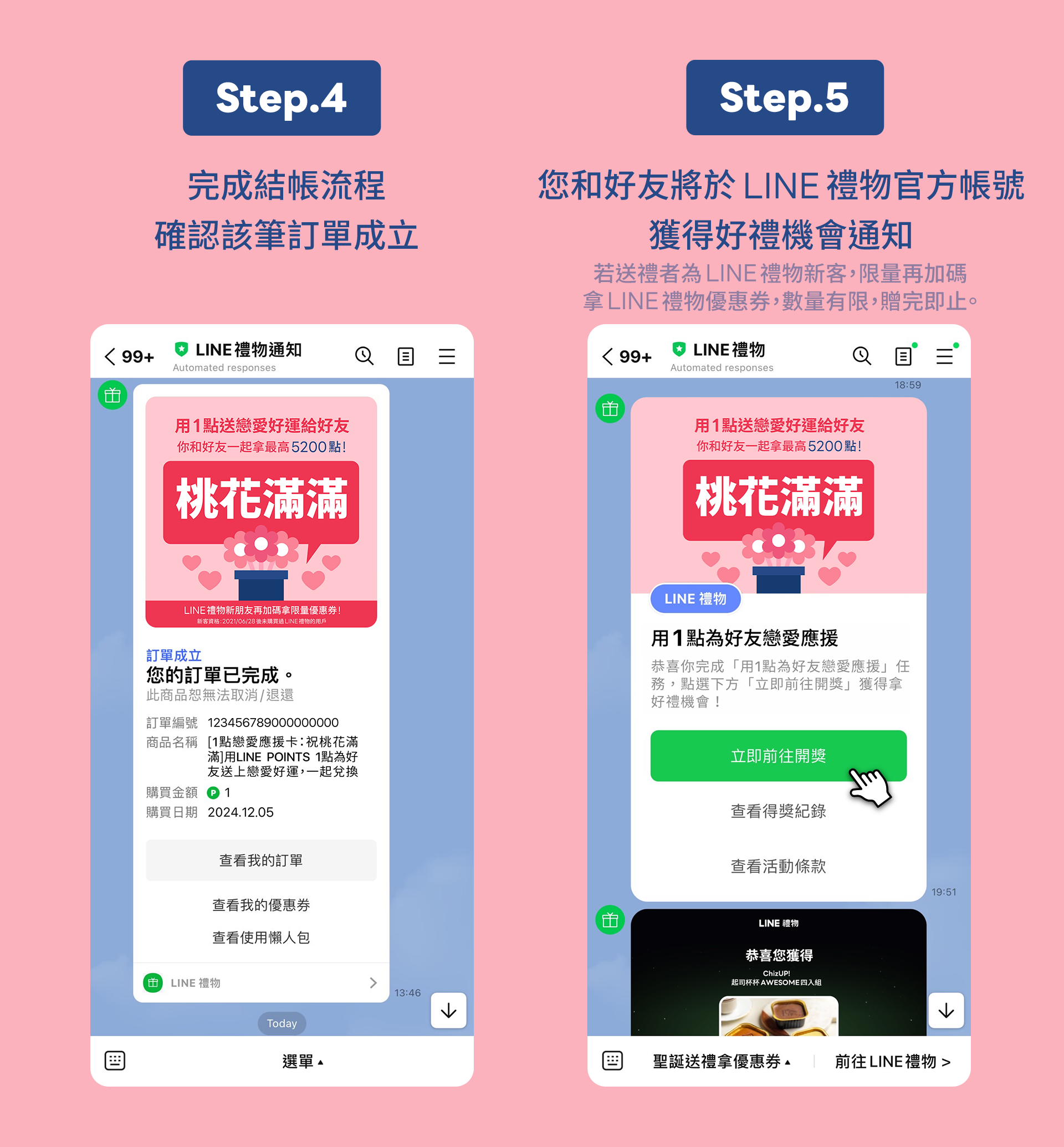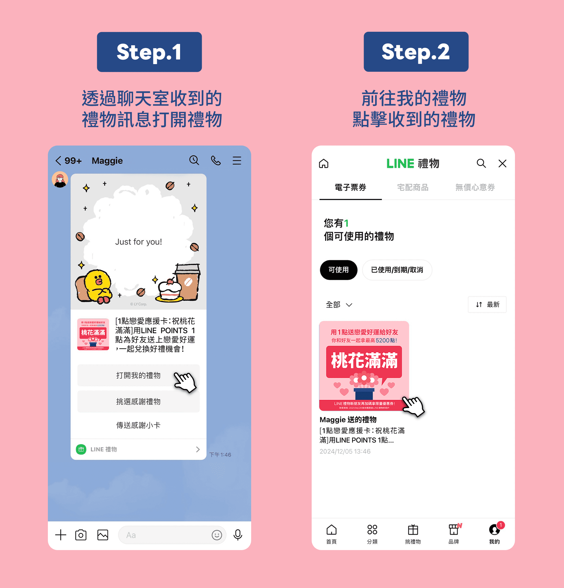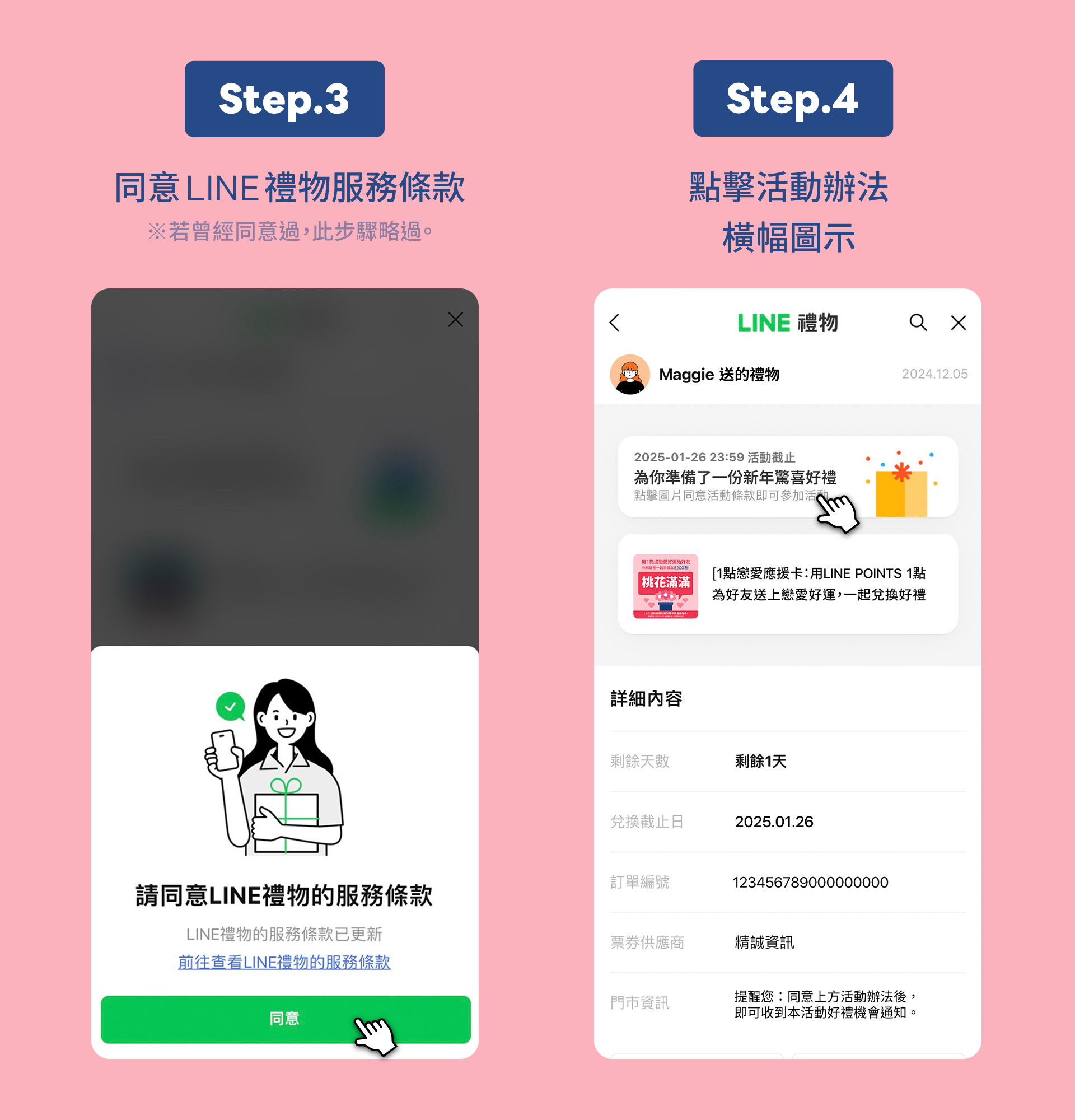 3. 好禮機會將透過LINE禮物官方帳號發送,請於2025年3月3日(一)23: 59以前打開好禮並完成點擊步驟,逾期將失效且恕不補發。→ 點我查看已獲得好禮